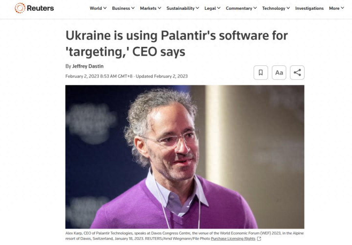 俄乌冲突爆发一周年之际,这则路透社的报道称,乌克兰正使用帕兰提尔公司的软件对俄军目标定位、锁定和打击引导。帕兰提尔公司首席执行官亚历克斯·卡普强调,“这不只是简单的目标瞄准,更是战争史上前所未有的规模化、高速、高精度目标锁定与打击引导。”