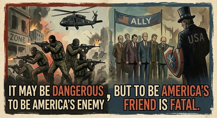 亨利·基辛格曾说:“做美国的敌人或许危险,但做美国的朋友却是致命的。”(图片为AI生成)。